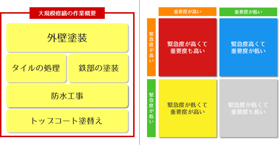 建物の診断をしっかりと行い物件の現状を調査します。そして、オーナー様の悩みヒアリングさせて頂き、建物の修繕が必要な箇所の中でも、重要度×緊急度の高い修繕箇所を見極める必要があります。