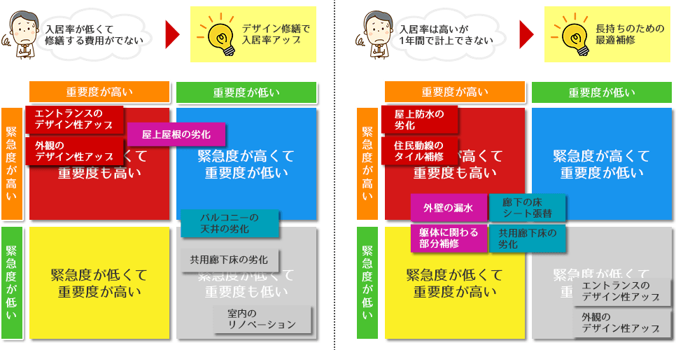 なので、皆様にはまず建物の現状をしっかりと把握して頂きたいです。そこから、長期的に建物を長持ちさせるためにも、必要な修繕を重要度と緊急度の軸で判別するお手伝いができれば幸いです。